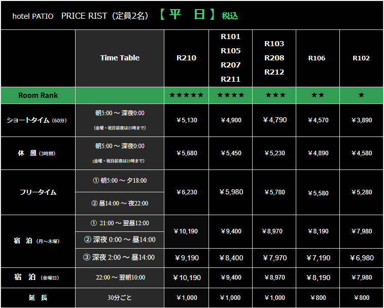 | 休 憩(3時間) | 朝5:00 ~ 23:00 (日曜・祝日は深夜0:00まで) | ¥5,900 | ¥5,670 | ¥5,450 | ¥4,980 | ¥4,780 |