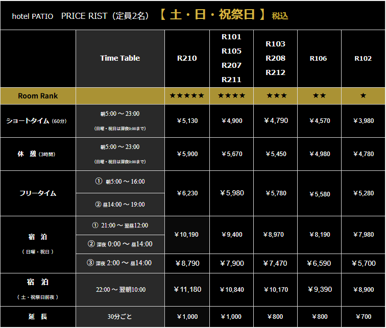 | hotel PATIO PRICE RIST(定員2名)【 土・日・祝祭日 】税込 | ||||||